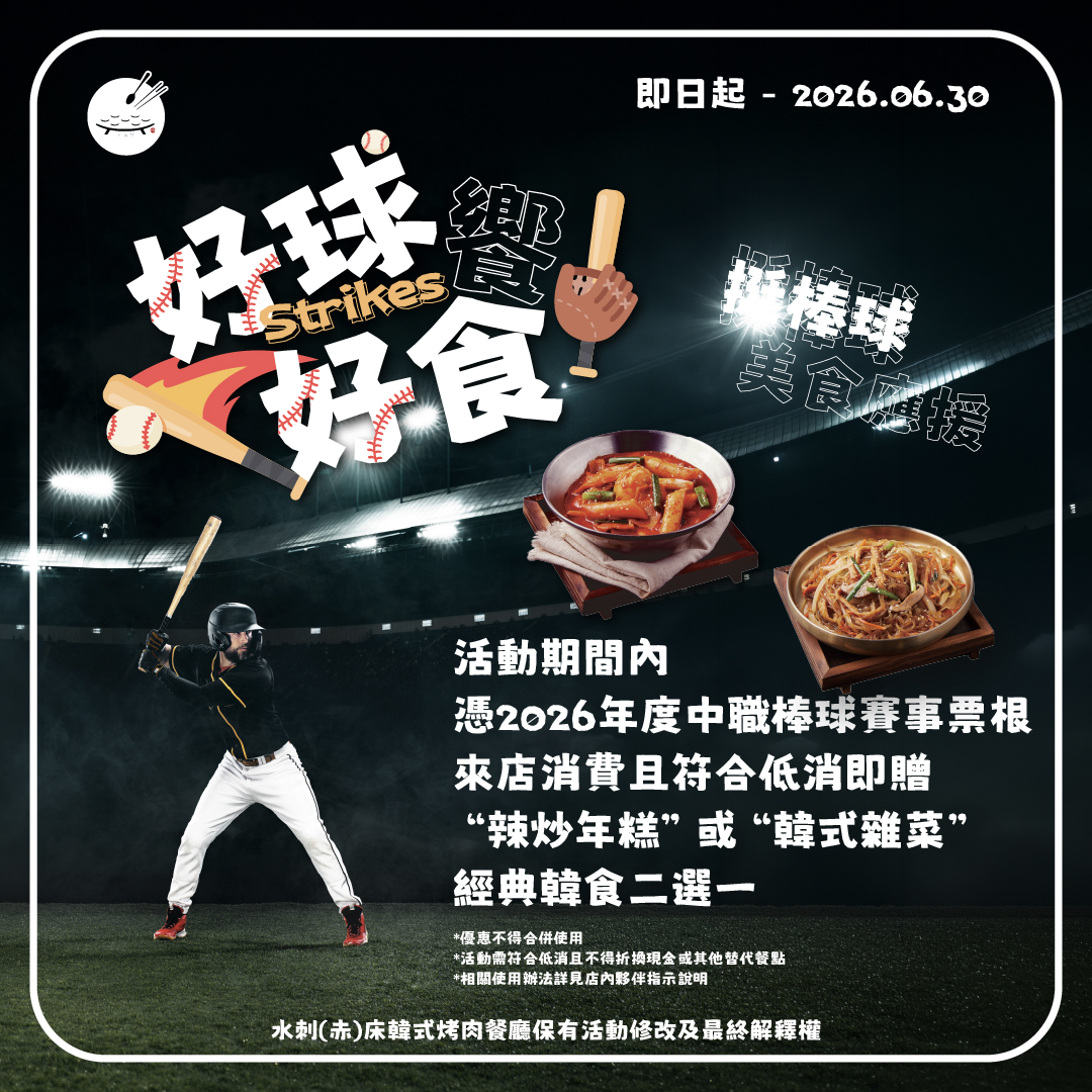 熱血棒球季來了,美食應援! 2026年中華職棒賽事全面開打,水刺床「好球饗好食」 活動時間|即日起 - 2026.06.30 活動期間內,持 2026年度中華職棒賽事票根來店消費滿低消, 即可贈送「辣炒年糕」或 「韓式雜菜」二選一! 共赴一場球賽,再赴一場道地韓式饗宴 從球場到餐桌,今年夏天的應援這樣最完整 入會消費累點超easy,會員好康獨饗 >> 馬上加入 -- 수라상韓式烤肉餐廳保有活動修改及最終解釋權